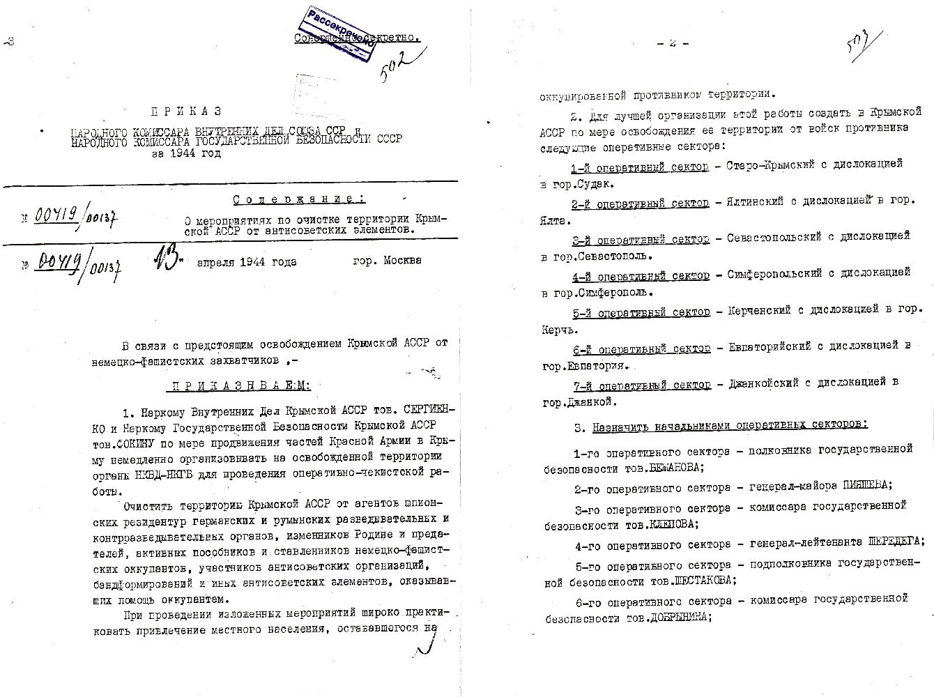 Приказ народного комиссара внутренних дел Лаврентия Берии и народного комиссара государственной безопасности Всеволода Меркулова «О мероприятиях по очистке территории Крымской АССР от антисоветских элементов». Переброска в Крым 20 тысяч бойцов НКВД