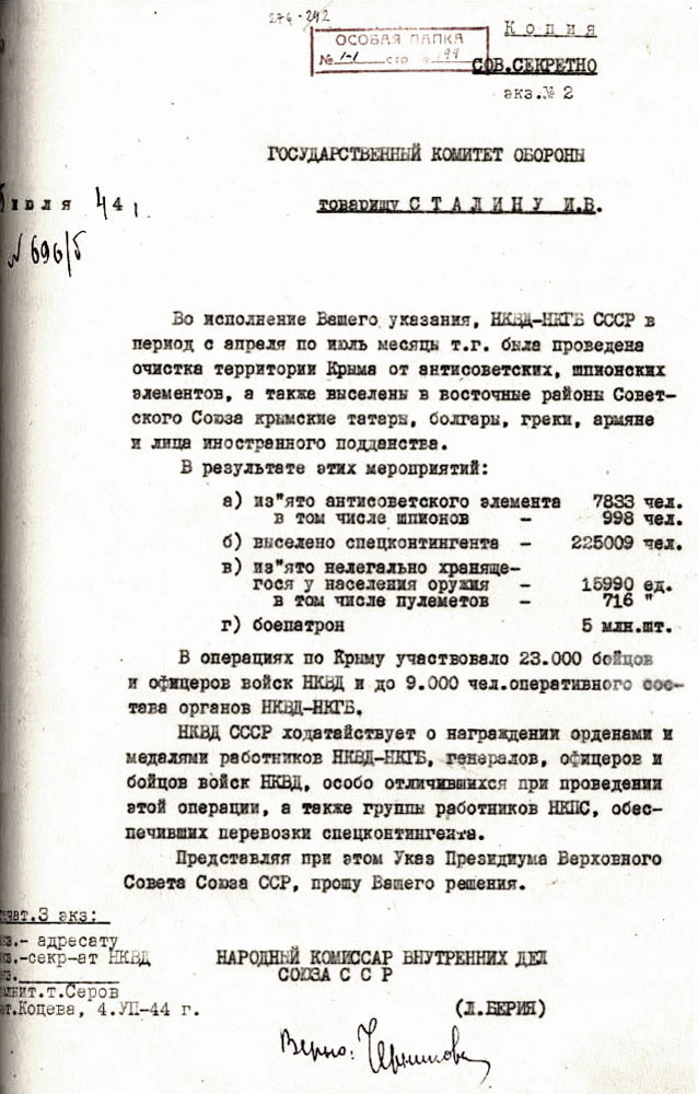 Донесение Лаврентия Берии имя Иосифа Сталина и Вячеслава Молотова об окончании операции по депортации крымских татар